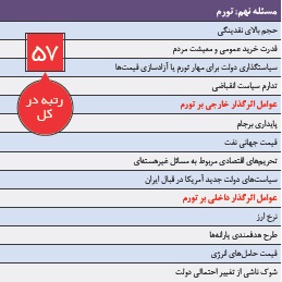 اقتصاد ایران در زمینه نرخ تورم به آرزوی خود رسید و این نرخ در سال ۹۵ تکرقمی شد اما تغییر مسیر این شاخص استراتژیک یکی از احتمالهای قوی در سال ۹۶ به حساب میآید. نرخ تورم ماهانه در اسفند سال ۹۵ به ۲ درصد رسید که در مقایسه با ماههای قبل از آن که عموما کمتر یک درصد برای هر ماه به ثبت میرسید، رقم بالایی محسوب میشود. حفظ تورم تکرقمی در دوره ۱۲ماهه زمانی اتفاق میافتد که میانگین تورم ماهانه از ۰.۸ درصد فراتر نرود. صندوق بینالمللی پول نیز نرخ تورم سال جاری ایران را ۱۱ درصد پیشبینی کرده است. از طرف دیگر افزایش درآمدهای نفتی نسبت به سال ۹۵ و ضرورت ایجاد تحرک در اقتصاد، احتمال رشد نرخ تورم را بالا برده است. دولت اما همچنان نرخ تورم تکرقمی را هدفگذاری کرده است. این گمانهها نشان میدهد که حفظ دستاورد تورم تکرقمی از چالشهای سال پیش رو خواهد بود. این موضوع به عنوان مسئله ۵۷ کشور در میان ۱۰۰ مسئله اصلی برگزیده شده است.