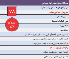 یکی از بخشهای محرک اقتصاد بخش مسکن است. توانایی ایجاد تعداد زیادی شغل به صورت مستقیم و غیرمستقیم بخش مسکن را به یکی از کلیدیترین بخشها در اقتصاد ایران بدل کرده است. نتیجه این نقش پراهمیت این است که با ایجاد رکود در این بخش سرعت حرکت رو به جلو اقتصاد کم میشود. ماهیت بازار مسکن در طرف عرضه و تقاضا به گونهای است که خواسته یا ناخواسته، رکودهای متناوب در آن عملا قابل پیشگیری نیست. اما تدوین سیاستهای مناسب میتواند در خروج سریعتر این بخش اقتصادی از کما موثر باشد. ایجاد قدرت خرید در سمت تقاضا از طریق تدبیر ابزار تسهیلات بلندمدت و با هزینه کم و متناسب با قدرت خرید تقاضاکنندگان اصلی مسکن یعنی جوانان، در فرآیند خرید میتواند راهکار خروج از این رکود و شکلگیری رونق باشد. البته نباید فراموش کرد که سفتهبازی گسترده در بازار مسکن علیرغم اینکه رونق را به این بازار برمیگرداند، سبب شکلگیری حبابهای قیمتی میشود و تورم این بخش را بهتدریج به سایر بخشهای اقتصادی منتقل میکند و از همه مهمتر دست مشتریان و مصرفکنندگان واقعی مسکن را که قدرت خرید بالایی ندارند، از این قلم ضروری کوتاه میکند. رکود مسکن مسئله ۷۸ ایران شناخته شده است.