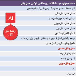 ناوگان حملونقل ایران دارای مشکلات زیرساختی است که از سالیان دور تاکنون پیامدهای گوناگونی را بر کشور تحمیل کرده است. از تلفات و خسارتهای بالای ناشی از سوانح جادهای که بخشی از آن به خاطر ناایمن بودن جادههاست تا موانع توسعه تجارت و رسیدن ایران به نقش ترانزیتی در منطقه بهدلیل کافی نبودن مسیرهای حملونقل ترانزیتی در این حوزه قابل دستهبندی است. در حوزه شهری نیز در شرایط فعلی مهمترین زیرساختی که نیازمند توجه و بهبود عملکرد است ناوگان حملونقل شهری است. انواع ملاحظات در این زمینه وجود دارد. دیدگاه زیستمحیطی و مقابله با آلودگی هوا، دیدگاه آرامشبخشی روانی به شهروندان و کاهش زمان ازدسترفته برای رفتوآمد و درنتیجه دستیابی به عملکرد بهتر کسبوکارها در سایه این ارتقای زیرساخت از مهمترین فواید توجه بیشتر به آن هستند. سال ۱۳۹۶ توسعه و ترمیم ناوگان حملونقل کشور بهخصوص در حوزههای هوایی، دریایی و ریلی بیشتر از پیش موردتوجه خواهد بود. ورود تعدادی از هواپیماهای جدید خریداریشده به داخل و راهاندازی راهآهن غرب کشور ازجمله مهمترین تحولات حوزه حملونقل خواهند بود. این موضوع بهعنوان مسئله ۸۱ در میان ۱۰۰ مسئله کشور در سال ۹۶ قرارگرفته است.