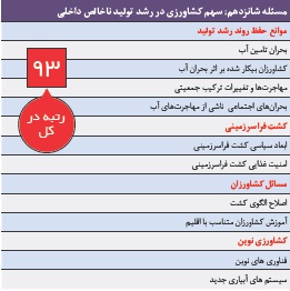 به جز نقاط معدودی از کشور، «الگوی کشت» با شرایط اقلیمی مناطق سازگاری ندارد. محصولات کشاورزی آببر در شرایط استمرار خشکسالیهای اخیر به طور کلی مزیت خود را از دست دادهاند و اصرار بر تولید داخلی آنها در واقع پافشاری بر تخصیص غیربهینه منابع محدود آبی است. صورت دیگر این رشد میتواند ساخت و توسعه صنایع جانبی محصولات کشاورزی باشد که از طریق ایجاد ارزش افزوده بالاتر موجب بهبود وضعیت اقتصادی کشاورزان و کاهش فشار بر منابع آبی شود. بهنظر میرسد با توجه به تشدید بحران آب و وقوع تنشهای آبی در بسیاری از استانهای کشور که فعالیت کشاورزان را تحت تاثیر قرار داده، ۱۳۹۶ سالی تعیینکننده برای کشاورزی باشد. حتی حفظ سهم فعلی بخش کشاورزی در رشد تولید ناخالص ملی نیاز به تجدید نظر در وضعیت کنونی و بهرهگیری از «فناوریهای نوین کشاورزی» بهویژه «سیستمهای آبیاری جدید» دارد. از سوی دیگر «کشت فراسرزمینی» با توجه ابعاد سیاسی و نقش تعیینکننده آن در «امنیت غذایی» در افقهای زمانی بلندمدت چندساله مورد توجه قرار خواهد گرفت. این موضوع، مسئله ۹۳ ایران در سال ۹۶ معرفی شده است.