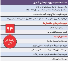 در ماههای پایانی سال ۱۳۹۵ واقعه پلاسکو بار دیگر بخشی از بحران پنهانمانده شهرهای ایران را آشکار کرد و ضرورت نوسازی شهری را به مطالبهای عمومی بدل ساخت. هرچند این سیاستگذارن و دولتها نیستند که شهرها را نوسازی میکنند بلکه مردم هستند که پوسته شهر را مطابق با انتظارات و خواستههایی که از شهر خود دارند به سمت مدرن شدن تغییر فرم میدهند، اما نقش مهم دولت و سیاستگذاران ارتقای وضعیت زیرساختها در شهرهاست. این وظیفه بهقدری مهم است که بخش قابل توجهی از مسئولیت آن به دولتهای محلی مثل شهرداریها تفویض شده است. بهنظر میرسد در سال ۱۳۹۶ از سویی ضرورت بافتهای فرسوده شامل بافتهای مسکونی شهری و روستایی و همینطور تجاری و اداری و از سوی دیگر ضرورت ایمنسازی ساختمانها بهخصوص در کلانشهرها از موضوعات موردتوجه باشد. همچنین لزوم تدقیق و تدوین قوانین در این حوزه، احتمالا پای نهادهای سیاستگذاری، قانونگذار و ناظر را نیز به این ماجرا خواهد گشود. این مسئله رتبه ۹۴ را در میان ۱۰۰ مسئله کشور در سال ۹۶ دارد.