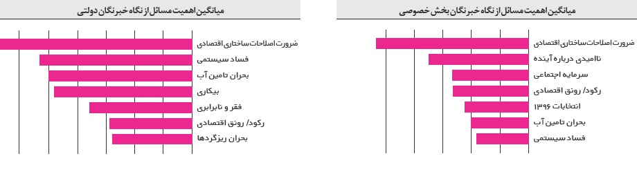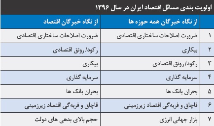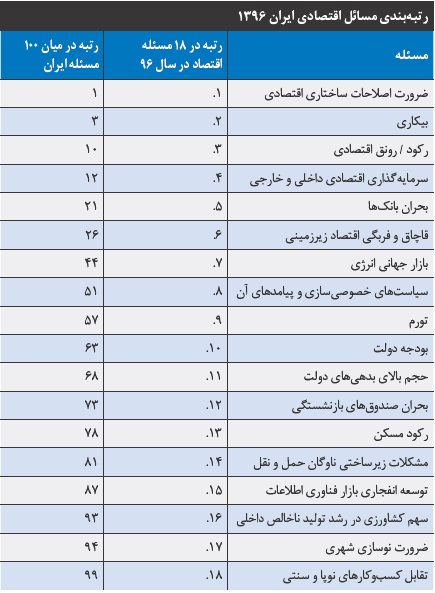 رتبهبندی ۱۰۰ مسئله کشور در سال ۹۶ نیز که با نظرسنجی از خبرگان و روشهای پژوهشی صورت گرفته نشان میدهد که اقتصاد پراهمیتترین مسئله ایران شناخته شده است. ضرورت «اصلاحات ساختاری اقتصادی» در صدر این رتبهبندی و بالاتر از مسئله تامین آب قرار گرفته است. پس از «بحران تامین آب» نیز موضوع «بیکاری» در رتبه سوم مهمترین مسائل کشور قرار گرفته است. رکود یا رونق اقتصادی نیز در رده دهم این رتبهبندی آمده است.
