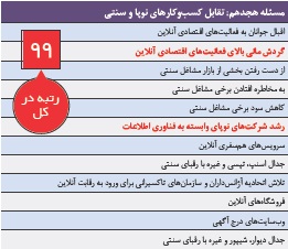 ورود استارتآپها به بازار کار در سال ۹۵ شکل جدیتری به خود گرفت. هرچند در یک دهه گذشته کسبوکارهای مبتنی بر وب، نشانههایی از کسبوکارهای نوین و وابسته به اینترنت را بروز داده بودند اما با روند سریع استفاده از اسمارتفونها و همهگیر شدن آن، کسبوکارهای جدید از سوی نسل جدید کارآفرینان کشور راهاندازی شده است. پدیدههایی نظیر اسنپ که در زمینه حملونقل شهری و تاکسی سرویس، تحول جدیدی به دنبال داشت، با مخالفتهایی از سوی آژانسداران و صاحبان قبلی این مشاغل، همراه شد. پیشبینیها نشان میدهد که در سال ۹۶، کسبوکارهای نوین جایگاه بیشتری در میان مشاغل کشور پیدا خواهد کرد بنابراین تقابل کسبوکارهای سنتی با این نوع مشاغل ازجمله مسائل پیش روی اقتصاد ایران به شمار میرود. این موضوع رتبه ۹۹ را در میان ۱۰۰ مسئله کشور در سال ۹۶ به خود اختصاص داده است.