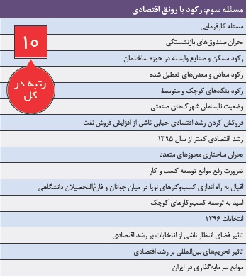 رکود اقتصادی به معنای از نفس افتادن فرآیند تولید و در نتیجه عدم ایجاد اشتغال متناسب یا حتی کاهش میزان اشتغال در جامعه است. نرخ رشد اقتصادی ۱۱.۶ درصدی در ۹ ماهه سال ۹۵، امیدواریها را برای تداوم روند رو به رشد تولید زنده کرده است اما این موضوع با مخاطرات زیادی مواجه است. از طرفی نقش اصلی رشد اقتصادی سال ۹۵ وابسته به رشد تولید نفت است که در سال ۹۶ اثر آن کاهش خواهد یافت؛ از سوی دیگر بنگاههای کوچک و متوسط به عنوان بخش اشتغالزای اقتصاد همچنان با رکود همراه هستند. بنابراین رکود یا رونق اقتصاد به عنوان یکی از اصلیترین مسائل اقتصاد ایران و دهمین مسئله کشور در سال ۹۶ انتخاب شده است.