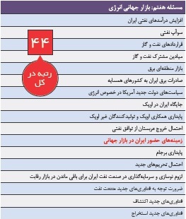 بازار جهانی انرژی هم بهعنوان مکانیسم تخصیصدهنده کمیابترین نهاده تولید و هم بهعنوان مهمترین بازار برای کسب درآمد کشورهای نفتی از اهمیت شایان توجهی برخودار است. به نظر میرسد تحولات بازار انرژی در سال ۱۳۹۶ تحت تاثیر چند عامل عمده قرار داشته باشد. نخستین عامل پیدایش فناوریهای نوین استحصال نفت است که ذخایر نفتی در دسترس دنیا و بهویژه امریکا را افزایش میدهد. این عامل باعث خواهد شد که قیمت نفت در کانال ۴۰ تا ۶۰ دلاری در سال ۱۳۹۶ ماندگار باشد. دومین مسئله بازیابی و افزایش سهم ایران در بازار انرژی نسبت به دوران قبل از تحریم است که باز از ناحیه عرضه افزایش قابل ملاحظه، قیمت انرژی را با محدودیت روبهرو میکند. سومین مسئله چشمانداز کاهش رشد اقتصادی چین بهعنوان یکی از اصلیترین متقاضیان نفت خام است که انتظار ثبات قیمت نفت را تحکیم میکند. تنها عاملی که میتواند موجب عدم تحقق ثبات قیمت نفت شود، درگیریها و مواجهههای نظامی شدید در منطقه جنوب غرب آسیا است. بر این اساس سال آرامی برای بازار انرژی پیشبینی شده است و کشورهای نفتی نباید چندان به بهبود وضعیت درآمدهای نفتی از محل افزایش قیمت نفت تکیه کنند. بازار انرژی به عنوان تامینکننده بخش مهمی از بودجه کشور در اقتصاد وابسته به نفت ایران مسئله هفتم اقتصاد و مسئله ۴۴ کشور معرفی شده است.