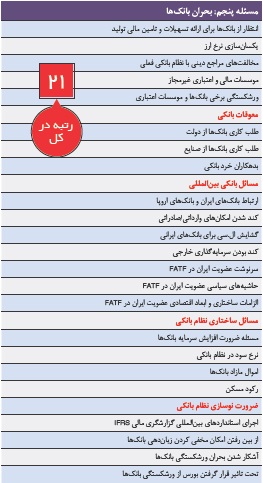 در وضعیت عدم شکلگیری بازار سرمایه عمیق، اقتصاد ایران به شدت بانکمحور شده است. بهطوری که میتوان گفت بیش از ۹۰ درصد از بار تامین مالی بنگاههای تولیدی وابسته به بانکهاست. در شرایطی که چنین وابستگی شدیدی به منابع بانکی وجود دارد، بروز هر بحرانی در شبکه بانکی میتواند به تمامی بخشهای اقتصاد تسری یابد. سیستم بانکی اکنون با حجم بالای مطالبات معوق و مشکوکالوصول مواجه است. از سوی دیگر سرمایهگذاری در بخش املاک و مستغلات به انجماد داراییهای آنها منجر شده است به همین دلیل رقابت بر سر جذب سپرده از سوی بانکها به افزایش نرخ سود بانکی فراتر از سطح واقعی اقتصاد منجر شده است. علاوه بر این در سال ۱۳۹۶ موضوع روابط بینالمللی بانکها نیز حایز اهمیت و تعیینکننده خواهد بود چراکه بانکها پس از رفع تحریمها به دلیل عقبماندگی از استانداردهای روز بانکداری هنوز موفق به برقراری روابط مطلوب با بانکهای بینالمللی نشدهاند، بنابراین اقتصاد ایران مهمترین رکن برقراری ارتباطات بینالمللی را به طور مطلوب در اختیار ندارد. فاصله نرخ سود بانکی با نرخ تورم از سوی رئیسکل بانک مرکزی به عنوان نماد، بحران بانکها معرفی شده است. ولیالله سیف صراحتا اعلام کرد که بانکها زیانده و دچار مشکل کمبود منابعاند. بنابراین مسئله بحران بانکها به عنوان پنجمین مسئله اقتصاد ایران و مسئله ۲۱ کشور در سال ۹۶ شناخته شده است.