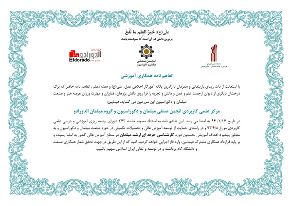 در روز دوشنبه چهاردهم اردیبهشت ماه نود و چهار در محل دفتر انجمن صنفی مبلمان و دکوراسیون تفاهم نامه همکاری سه جانبه ای در حوزه علمی و فناوری با یکی از گروه های تولیدی مبلمان کشور(گروه مبلمان الدورادو)، این انجمن و مرکز طراحی و تولید مبلمان و دکوراسیون به امضا رسید. پیرو این تفاهم، قراردادی نیز به امضای مدیران این گروه تولیدی و ریاست محترم مرکز علمی کاربردی انجمن منعقد گردید.