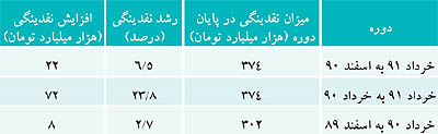 اما با در نظر گرفتن رقم ۳۷۴ هزار میلیارد تومان نقدینگی در پایان خرداد ماه سال جاری محاسبات نشان میدهد که رشد عدد این متغیر پولی در اقتصاد کشور در ۱۲ ماه منتهی به خرداد ماه سال جاری نزدیک به ۲۴ درصد بوده است. بر این اساس میزان نقدینگی در اقتصاد کشور در خرداد ماه سال ۹۰ در سطح ۳۰۲ هزار میلیارد تومان بوده است و این رقم با افزایش ۷۲ هزار میلیارد تومان رشد ۸/۲۳ درصدی را تجربه کرده و در خرداد ماه سال جاری از سطح ۳۷۴ هزار میلیارد تومان گذشته است.