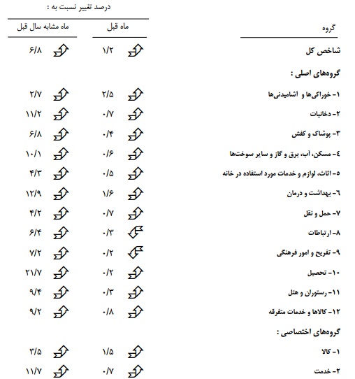 خلاصه نتایج به‌دست آمده از شاخص بهای کالاها و خدمات مصرفی در مناطق شهری ایران براساس سال پایه ۱۰۰=۱۳۹۰ به شرح زیر است: شاخص بهای کالاها و خدمات مصرفی در مناطق شهری ایران در خرداد‌‌ماه ۱۳۹۵ به عدد ۲۴۰.۹ رسید که نسبت به ماه قبل ۱.۲ درصد افزایش یافت. همچنین شاخص مذکور در خرداد‌‌ماه ۱۳۹۵ نسبت به ماه مشابه سال قبل معادل ۶.۸ درصد افزایش داشته است.»