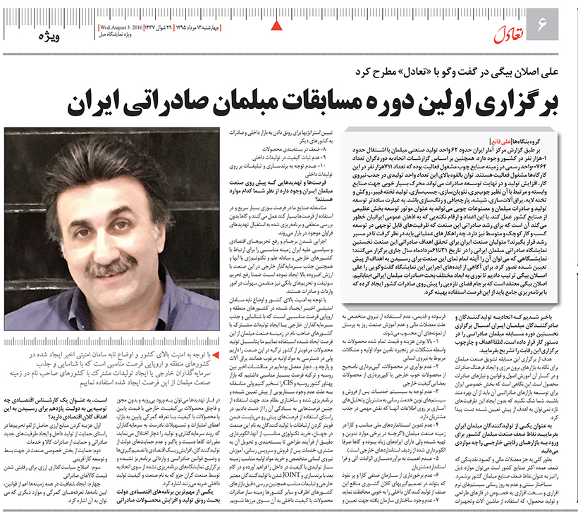 برگزاری اولین دوره مسابقات مبلمان صادراتی ایران ۲۰ مرداد, ۱۳۹۵ اخبار, اخبار نمایشگاه ها/همایش ها نظر دهید 2,755 بازدید علی اصلان بیگی در گفت و گو با تعادل مطرح کرد برگزاری اولین دوره مسابقات مبلمان صادراتی ایران ۱۳۹۵-۰۵-۲۰ پشتیبانی سایت اشتراک فیس بوک Google + LinkedIn Pinterest
