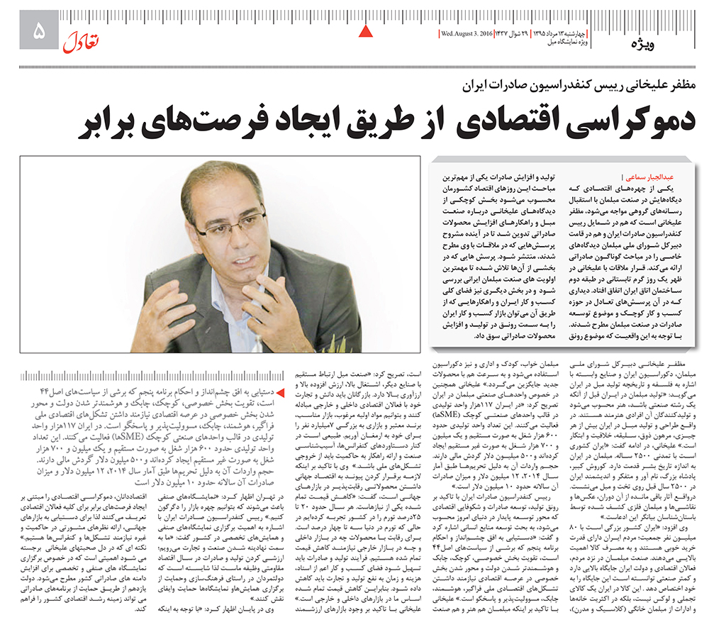 دموکراسی اقتصادی از طریق ایجاد فرصت های برابر ۱۹ مرداد, ۱۳۹۵ اخبار, اخبار نمایشگاه ها/همایش ها, خبر روز نظر دهید 1,643 بازدید مظفر علیخانی رییس کنفدارسیون صادرات ایران در گفتگو با تعادل مطرح کرد ۱۳۹۵-۰۵-۱۹ پشتیبانی سایت اشتراک فیس بوک Google + LinkedIn Pinterest