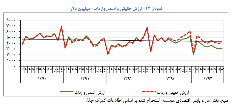 روند کاهش واردات از فصل اول سال ۹۴ آغاز شد و تا فصل سوم این سال ادامه پیدا کرد. براساس آمار گمرک جمهوری اسلامی ایران، ارزش دلاری واردات در سومین فصل سال ۹۴، ۲۶.۳ درصد نسبت به مدت مشابه در سال گذشته کاهش یافته است و رشد منفی کالاهای وارداتی، بطور هماهنگ در سه دسته مصرفی، واسطه ای و سرمایه ای رخ داده.