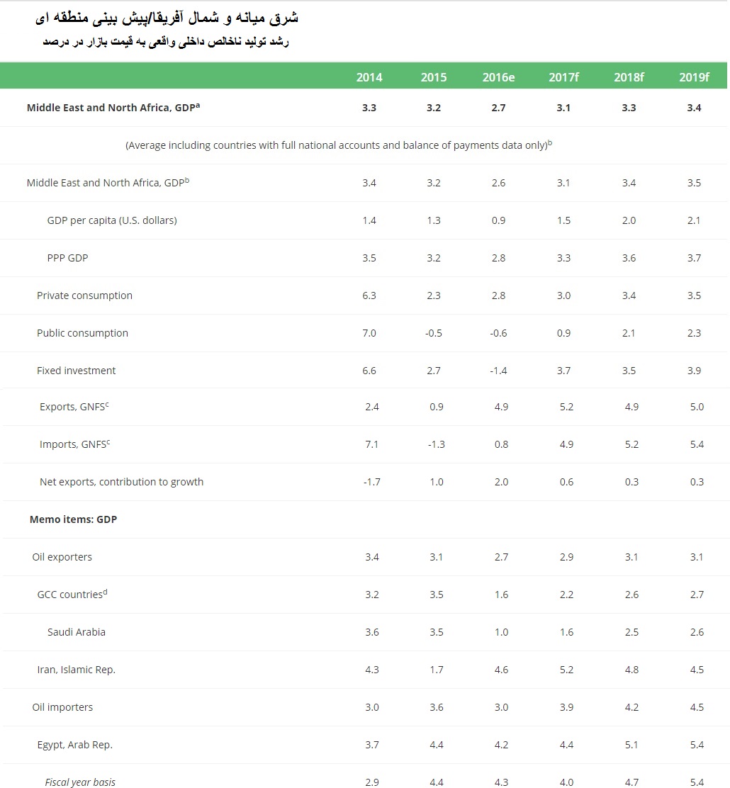 برای اقتصادهای صادرکننده نفت، باوجود رشد قوی صادرات در جمهوری اسلامی ایران، بهبود ایجادشده است. اما این رشد در سال ۲۰۱۸ کمی کندتر از حد انتظار در اواسط سال ۲۰۱۶ میشود. این موضوع هم به دلیل برنامه تثبیت مالی کشورهای عضو شورای همکاری خلیجفارس و عراق و محدودیت ظرفیت تولید نفت عراق است.