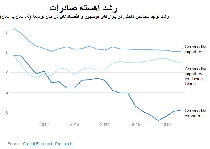 کاهش قیمت و تضعیف تجارت جهانی ادامه دارد که باعث ایجاد شرایطی برای به چالش کشیدن صادرات کالا در بازارهای نوظهور و اقتصادهای درحالتوسعه شده است. با توجه به چشمانداز اقتصاد جهانی در سال ۲۰۱۶، صادرات در این کشورها رشد آهستهتری نسبت به واردات داشتهاند.