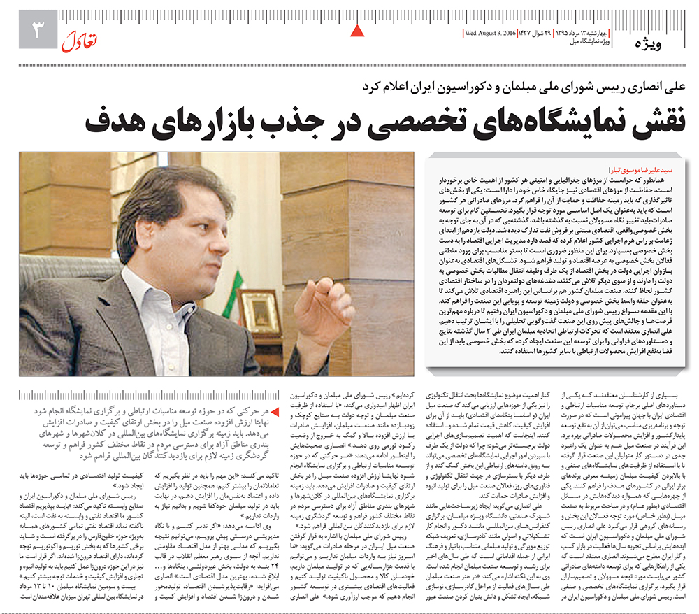 نقش نمایشگاه های تخصصی در جذب بازارهای هدف ۱۹ مرداد, ۱۳۹۵ اخبار, اخبار نمایشگاه ها/همایش ها, خبر روز نظر دهید 3,412 بازدید مصاحبه مهندس علی انصاری رییس شورای ملی مبلمان و دکوراسیون ایران با روزنامه تعادل نقش نمایشگاههای تخصصی در جذب بازارهای هدف ۱۳۹۵-۰۵-۱۹ پشتیبانی سایت اشتراک فیس بوک Google + LinkedIn Pinterest